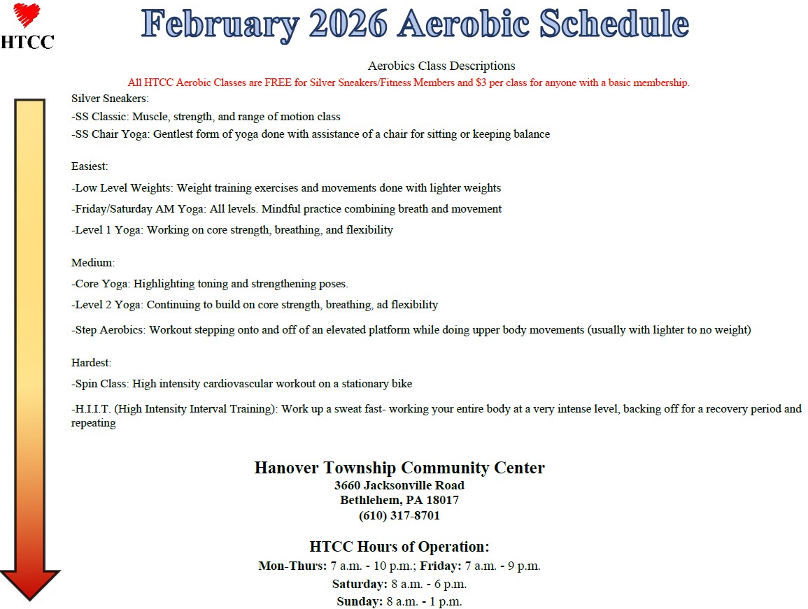 This includes all basic membership privileges, plus FREE use of the fitness room, FREE aerobic classes, and discounted rates on HTCC programs.