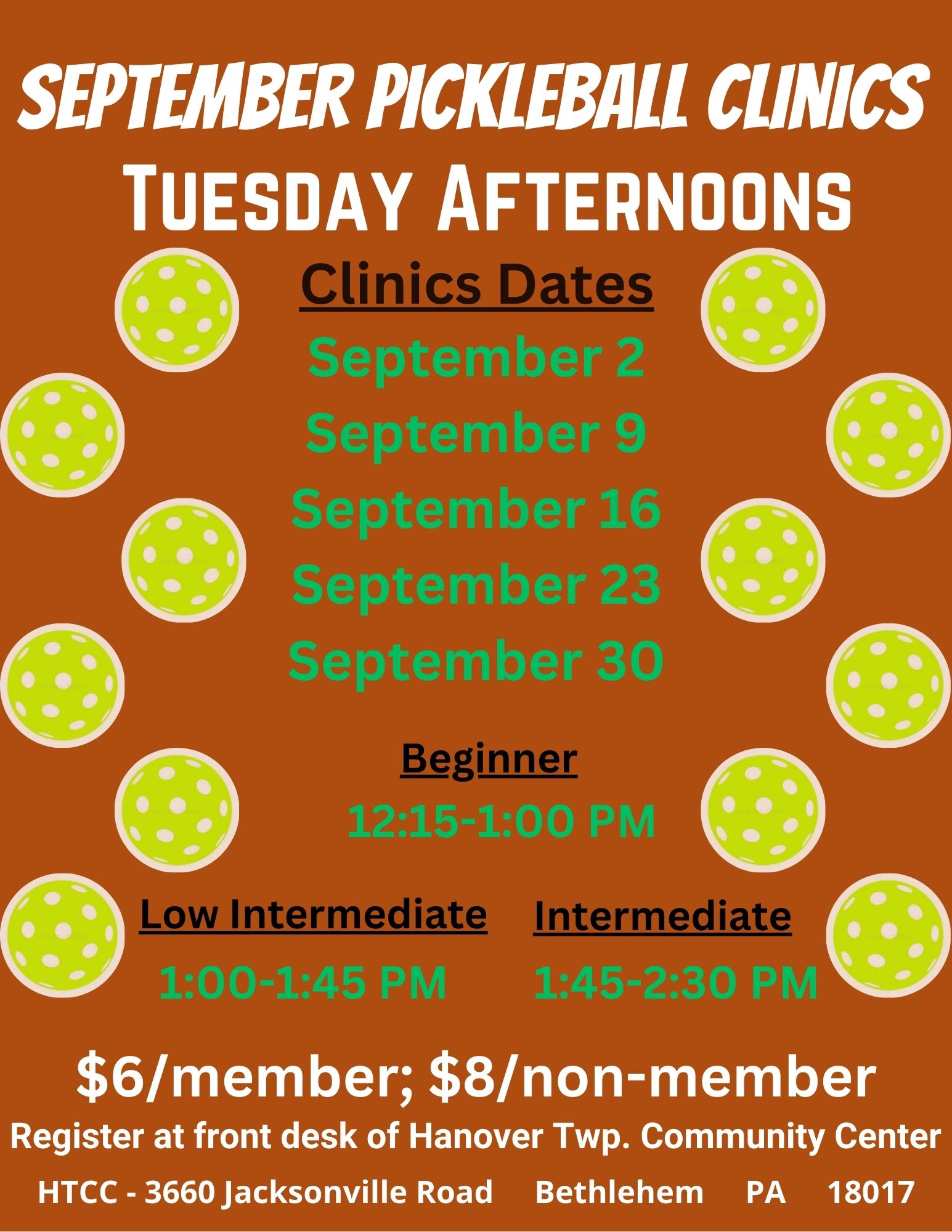 Open play runs Monday-Friday from 12-2:30 p.m. inside the HTCC Gymnasium. All levels of play are welcome - beginner, intermediate, and advanced. HTCC also runs clinics on Tuesdays for all three levels, along with various tournaments and leagues throughout the year.