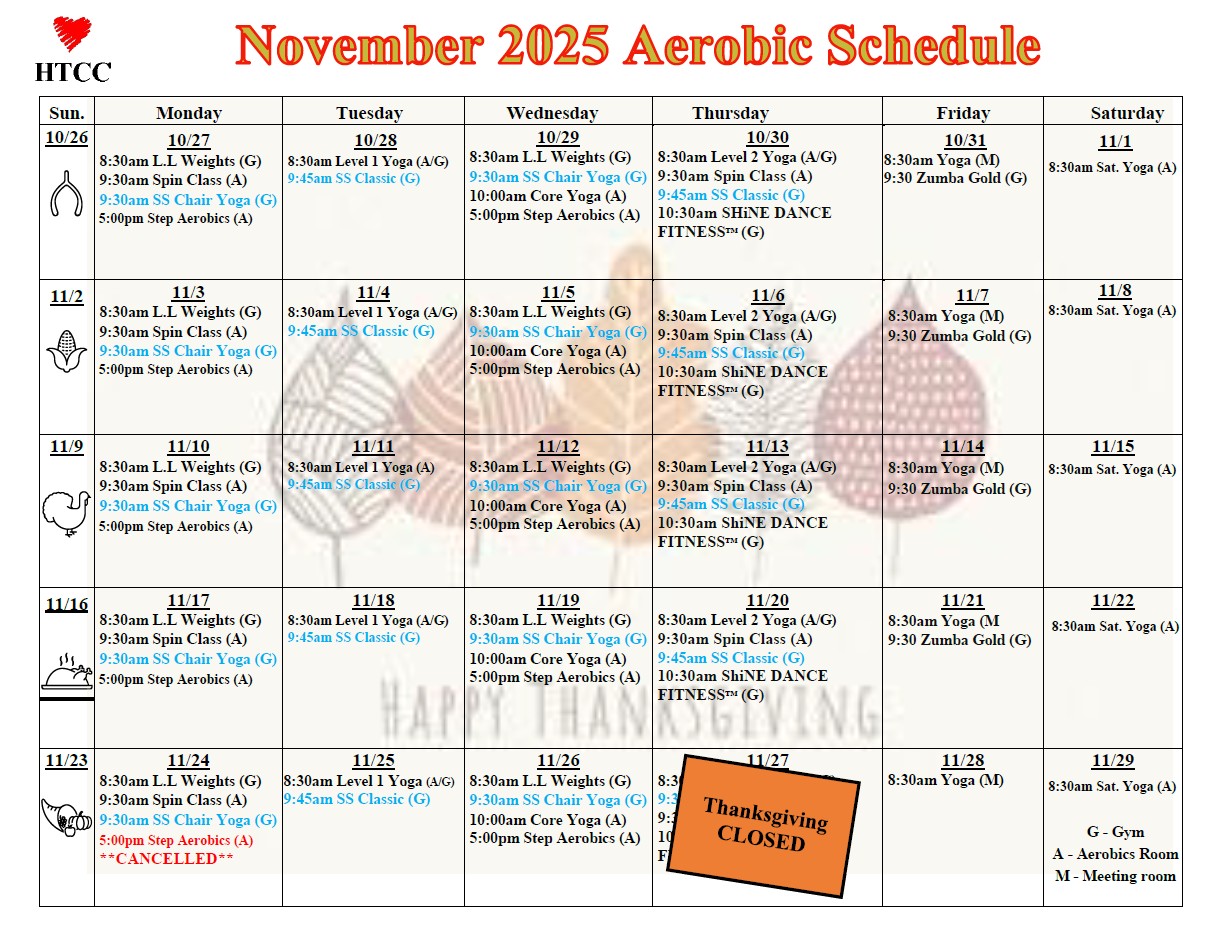 HTCC hosts a full aerobic program, offering numerous group fitness classes. They include, but are not limited to, Zumba, Step Aerobics, Yoga, Spinning, and more. Our Aerobics Schedule is updated monthly. HTCC reserves the right to cancel classes at their own discretion; every effort will be taken to post cancellations ahead of time